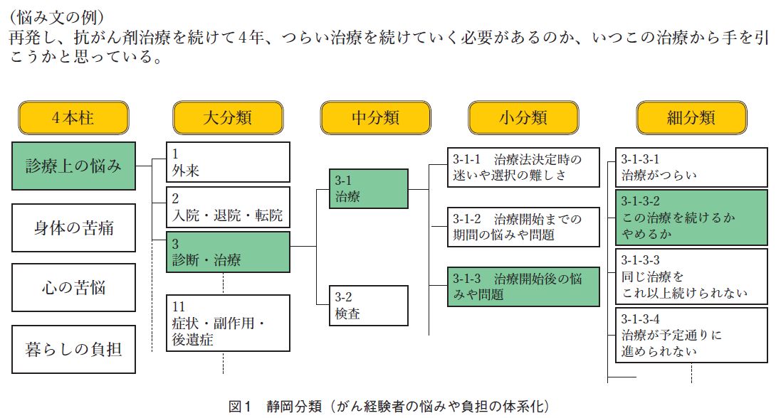 そこで、まず多くの[Silent Majority]を含んだがん患者の悩みや負担を自由記述回答による調査で収集し、体系化を行いました。具体的には、2003年、筆者が参加した厚生労働省の研究グループでは、がん体験者の悩みや負担の大規模実態調査1 を実施し、7,885人のがん体験者の「生の声」を自由記述回答で収集しました。悩みや負担の自由記述内容は、キーワードごとに切り分け、2万6千件の悩みの短文を抽出しました。その悩みの短文を、類似した内容ごとのまとまりに集約し、四つの柱と4階層からなる「静岡分類」(図1)として体系化して悩みのデータベースを構築し、静岡がんセンターホームページのコンテンツの一つ「がん体験者の悩みQ&A2」で公開しています。