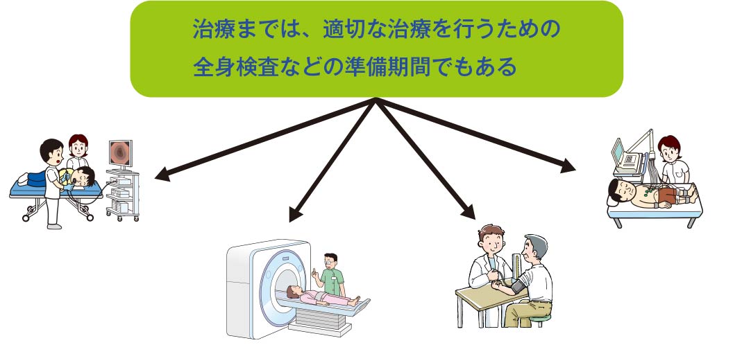 治療方針を決める時は、ただ「○○がんである」というだけで決めるのではありません。どういう細胞の種類のがんなのか、どのくらいの病期(病気の進行の程度)なのか、転移があるとしたらどこにどの程度あるのか、その他に病気はないのか、現在その他の病気で治療を継続しているものがあるとしたら、それはこのがんの治療に影響しないのか、からだのさまざまな機能に異常はないか(心機能、肺機能、腎機能、肝機能など)等を総合的にみて検討していくのです。これは、その方にあった適切な治療を安全に行うために欠かせないものです。ただ、自宅で入院待ちをしているのではなく、その間にも治療に向けてスケジュールは進んでいることを理解しましょう。