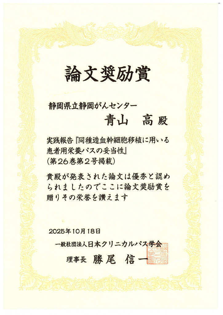 青山 高 管理栄養士、第25回日本クリニカルパス学会学術集会において「論文奨励賞」を受賞しました