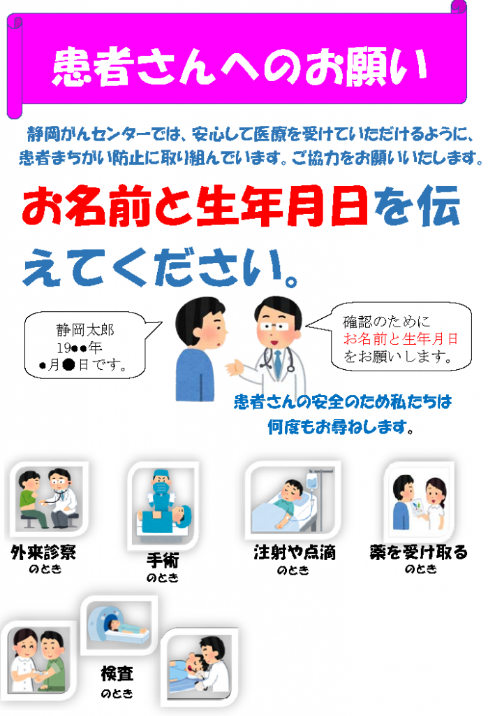 当院では、患者さんに安全に医療を受けていただくため、受付・会計・検査・処置の際に、お名前と生年月日の確認をおこなっております。これは、患者さんの取り違いを防ぐために必要な医療安全上の取り組みです。個人情報の取り扱いには十分に配慮し、必要最小限情報のみを確認しております。ご負担をおかけしますが、安全確保のための大切な確認ですので、ご理解とご協力をお願いいたします。