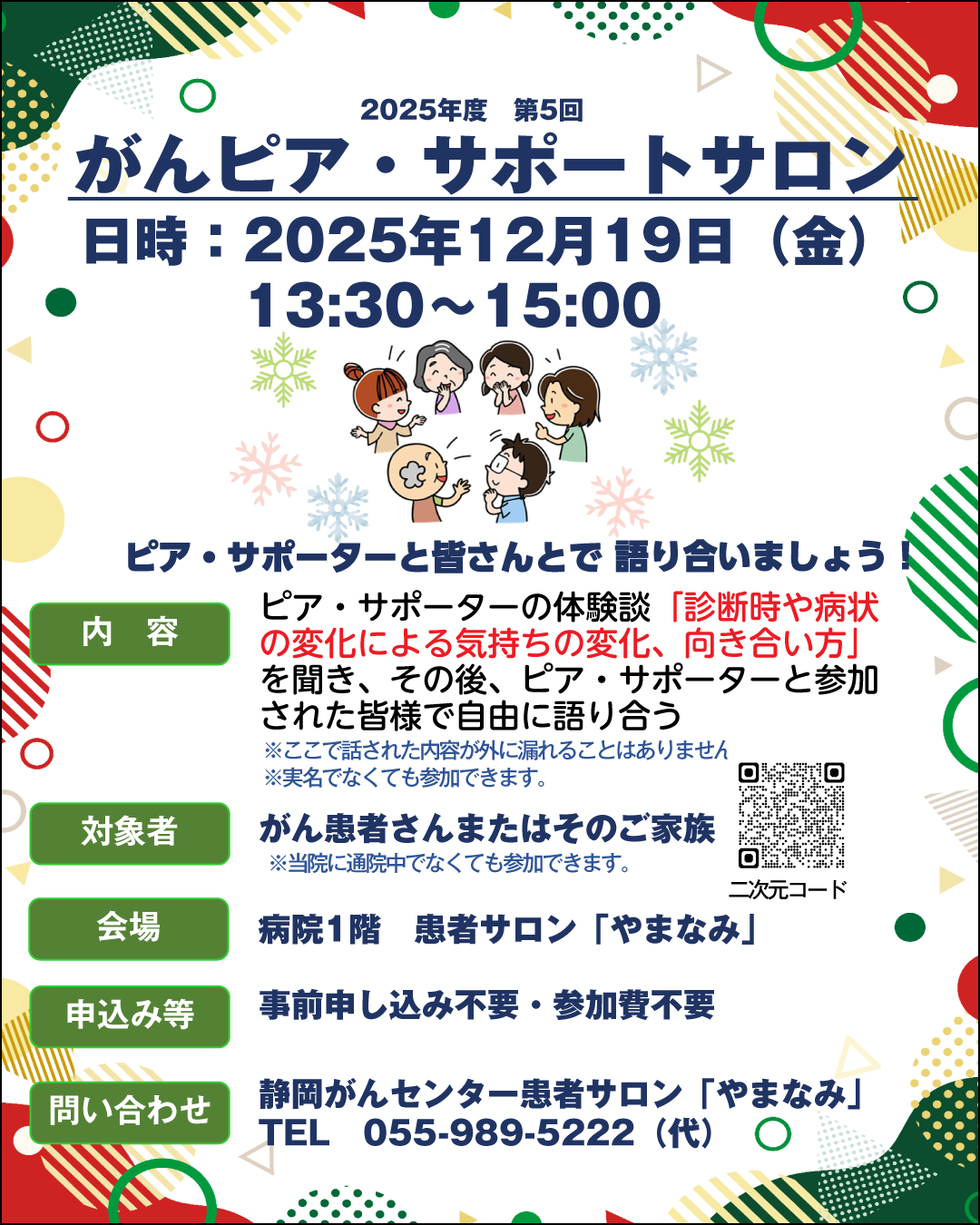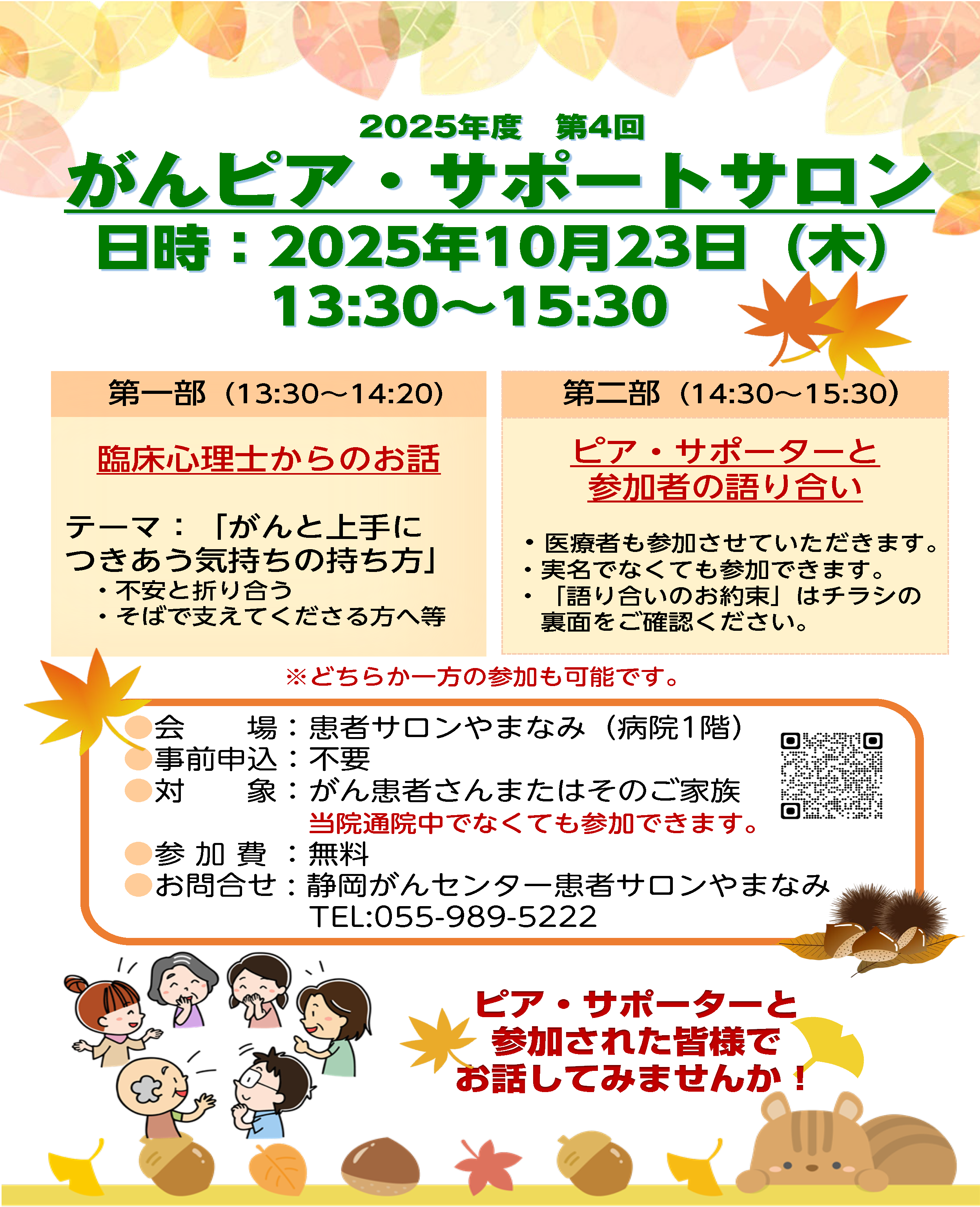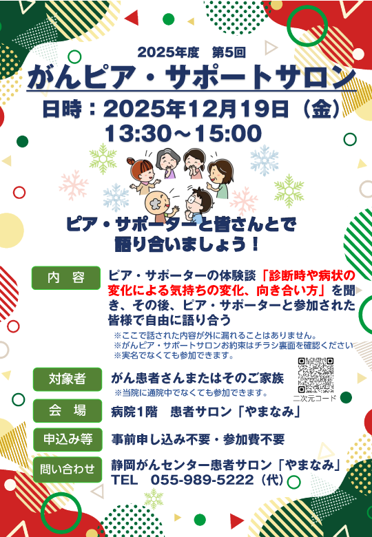 | 対象者 | がん患者さんとそのご家族 ※静岡がんセンターでの治療歴がなくても参加できます |