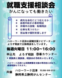 がんで長期療養しながら働きたいという方を対象に、ハローワーク沼津の就職支援ナビゲーターがよろず相談で出張相談を行っています。